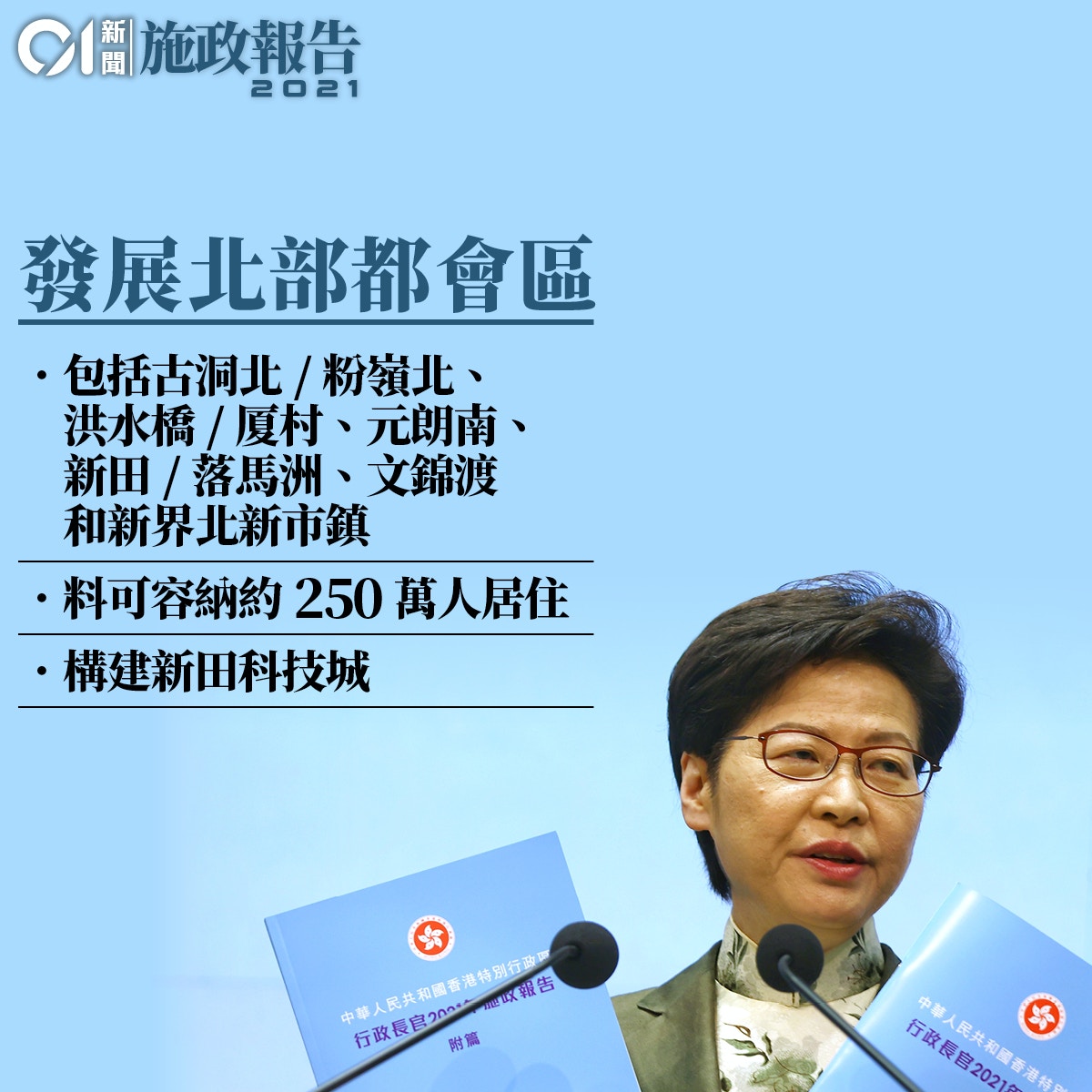 2020年度施政重點回顧 2021年財政年度施政報告文本 2021年財政年度施政報告重點 2021年財政年度各領域施政重點. 行政長官林鄭月娥公布任內最後一份施政報告提出多個有關房屋及未來土地供應大計首先打造北部都會區提供住宅單位約165 000至186 000個最終該區總供應單位逾90萬個未來十年建公營房屋33萬個私營單位供應10萬個中長期提供約400 000至500000個公私營房屋單位. 施政報告2021提跨任期措施 林鄭否認為連任淨返10日都會爭取 23條林鄭批過往政府遮遮掩掩理直氣壯立法 惟本屆通過不實際 施政報告2021林鄭積極推展23條立法 打擊假新聞保網絡安全 施政報告2021政府大改組 研設副司長主理新界北 增文體旅遊局.